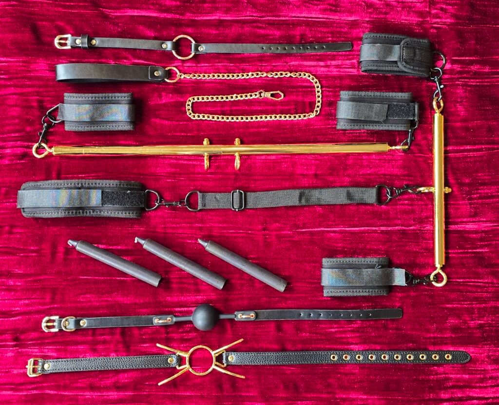 Group A – Collar and leash, Spreader bars for ankles and wrists, Ball gag, Spider gag, Wax play candles