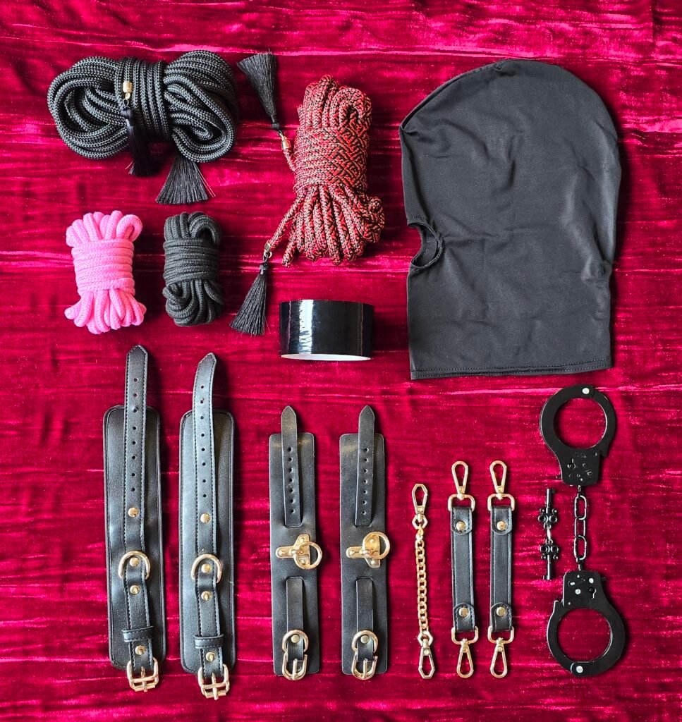 Group B – Assorted lengths of rope, PVC bondage tape, ankle cuffs, wrist cuffs, attachments for hogtie, handcuffs, sensory deprivation hood