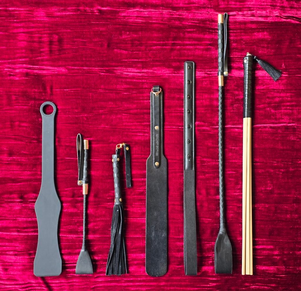 Group D – Flexible silicone paddle, small riding crop, small flogger, leather paddle, leather strap, large riding crop, cane bundle