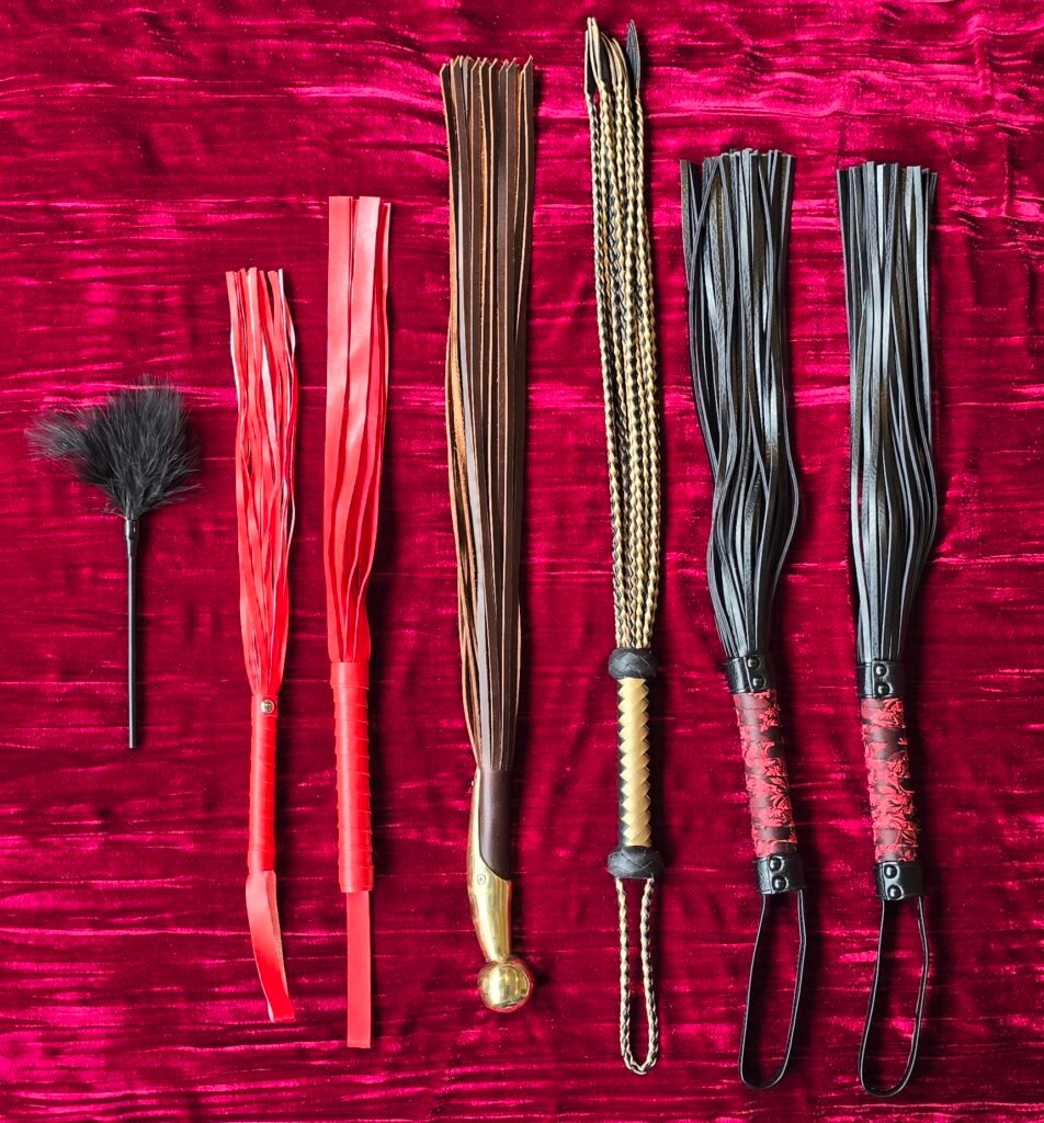 Group E – Feather tickler, low impact red floggers, high impact brown leather flogger with gold handle, medium impact black and gold braided leather flogger, medium impact black and red matching floggers